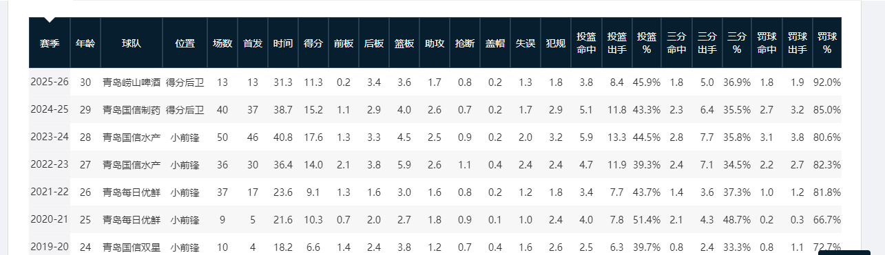 尽管赛制变更为单节10分钟,出场时间减少,本赛季13次出场后,王睿泽场均仍可砍11.3分3.6篮板1.7助攻,投篮命中率为45.9%。而在过去的三个赛季,他的表现更为亮眼,单赛季最少场均得分也有14分,最高可达到17.6分。从数据上看,他已然成为CBA联盟中的优等锋线。